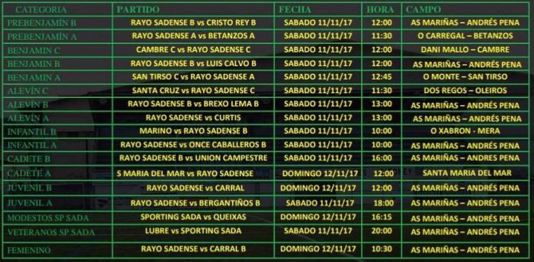 Horario partidos 11-12 de noviembre HorariosBy Sada Cf08/11/2017Pasamos a informar de los partidos de nuestros equipos este próximo Fin de Semana.