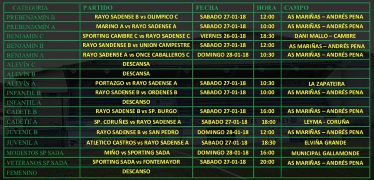 HORARIOS COMPETICIONES 27-28 ENERO HorariosBy Sada Cf23/01/2018Pasamos a informaros de los horarios de los partidos a disputar, el próximo fin de semana