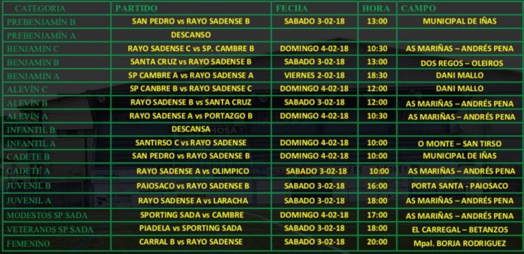 HORARIOS COMPETICIONES 3-4 FEBRERO HorariosBy Sada Cf31/01/2018Informamos de los partidos a Disputar este próximo fin de semana.