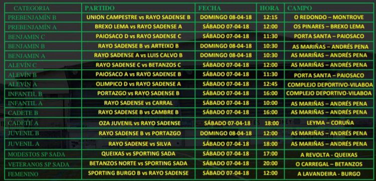 HORARIOS COMPETICIONES 7-8 ABRIL HorariosBy Sada Cf03/04/2018Informamos de los partidos a Disputar este próximo fin de semana.