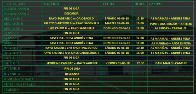 HORARIOS DE COMPETICIONES 1-2-3-5 JUNIO HorariosBy Sada Cf31/05/2018Informamos de los partidos a disputar los próximos días.