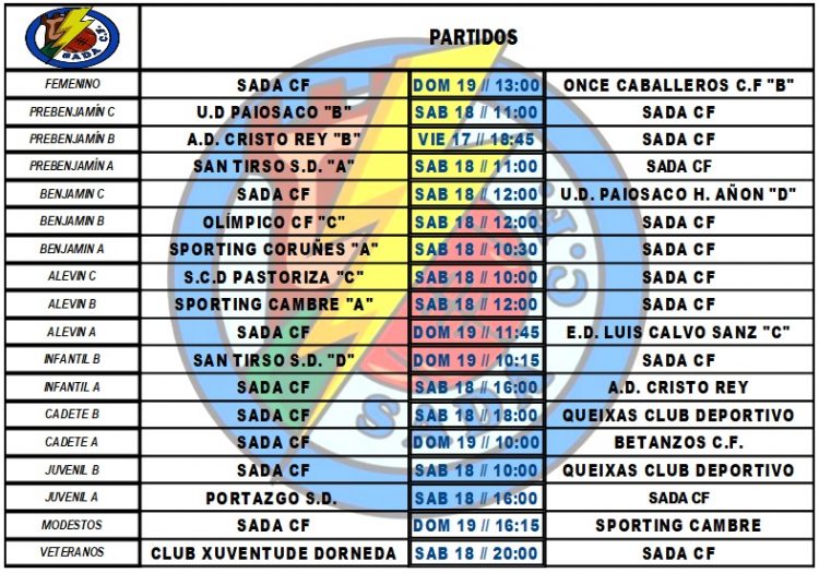 PARTIDOS FIN DE SEMANA HorariosBy Sada Cf15/01/2020Partidos a disputar por nuestros equipos en el fin de semana.