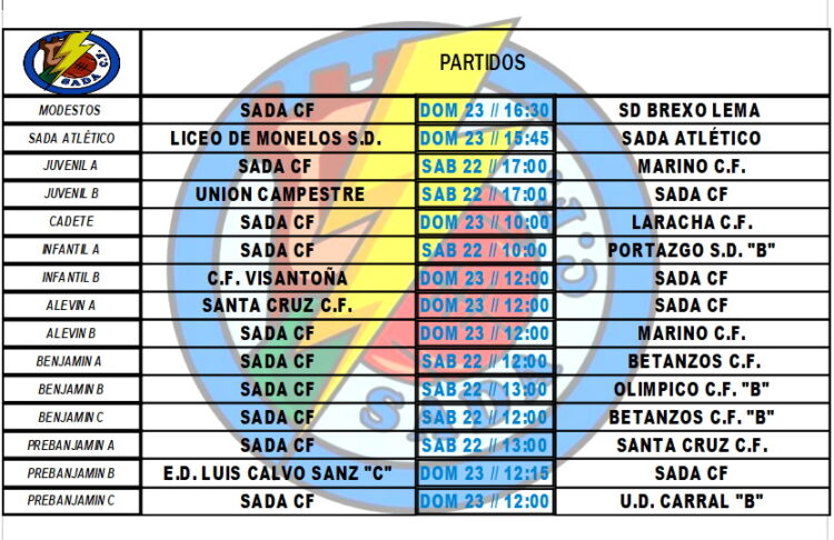 PARTIDOS OFICIALES FIN DE SEMANA HorariosBy Sada Cf19/01/2022Partidos a disputar por nuestros equipos en el fin de semana.