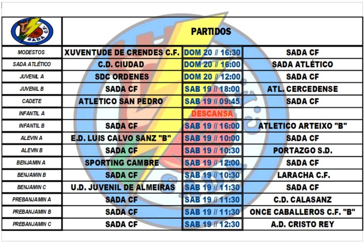 PARTIDOS OFICIALES FIN DE SEMANA HorariosBy Sada Cf16/02/2022Partidos a disputar por nuestros equipos en el fin de semana.