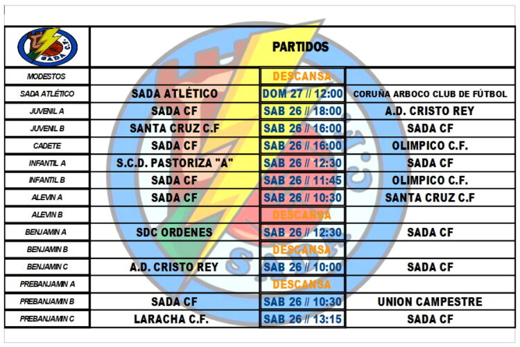 PARTIDOS OFICIALES FIN DE SEMANA HorariosBy Sada Cf22/02/2022Partidos a disputar por nuestros equipos en el fin de semana.