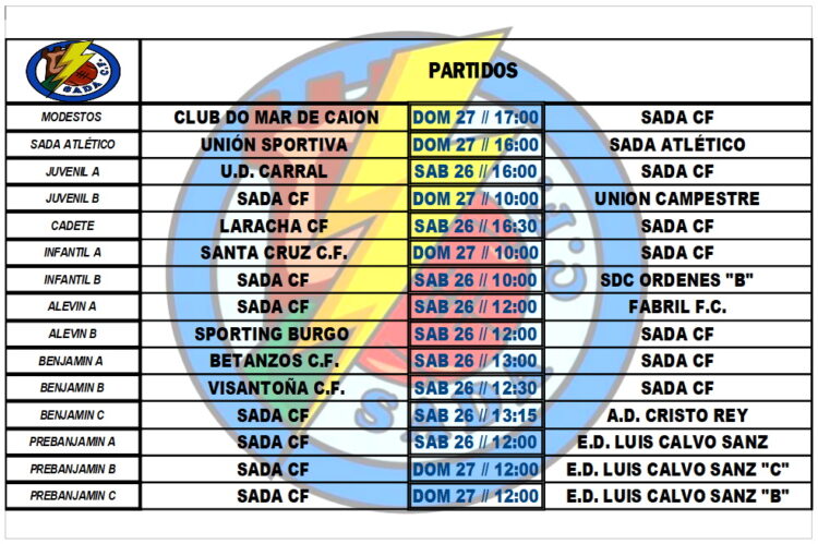 PARTIDOS OFICIAIS PARA ESTA FIN DE SEMANA HorariosBy Sada Cf22/03/2022Partidos a disputar por nuestros equipos en el fin de semana.