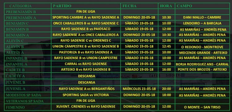 El Club de Futbol Rayo Sadense & Sporting Sada organiza conjuntamente a través de la Asociación Arredemo, el I Campus de Futbol Perla das Mariñas, con el fin de que puedas seguir disfrutando de tu deporte favorito en las vacaciones de verano. Las persoas interesadas podrán inscribirse en el correo electrónico sclubarredemo@gmail.com,en el propio campo…