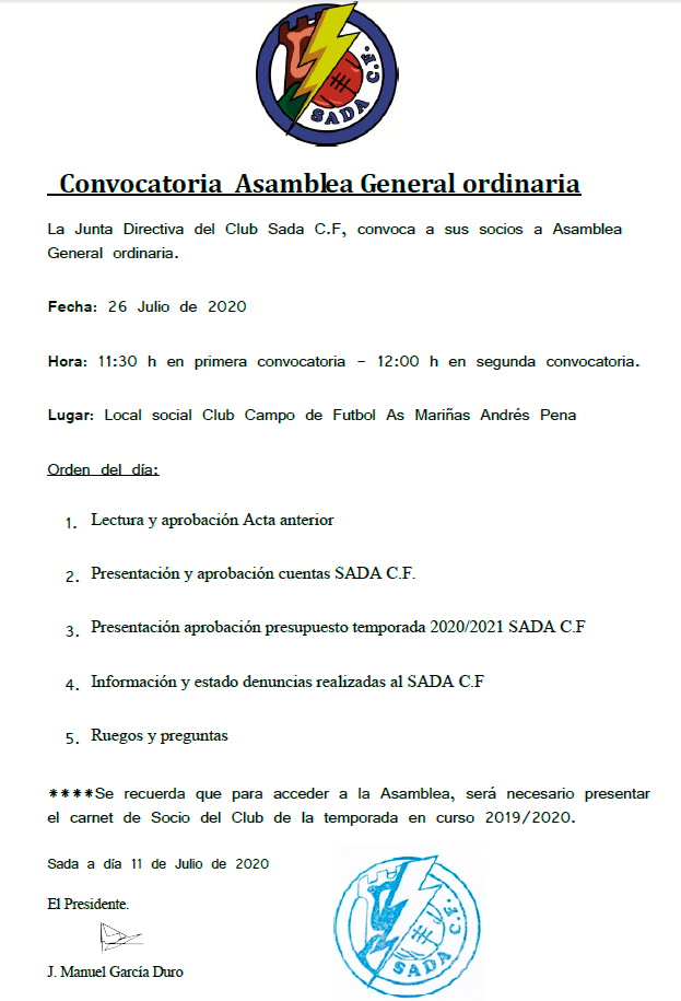Convocatoria Asamblea General ordinaria La Junta Directiva del Sada C.F, convoca a sus socios a Asamblea General ordinaria. Fecha: 26 Julio de 2020 Hora: 11:30 h en primera convocatoria – 12:00 h en segunda convocatoria. Lugar: Local social Club Campo de Futbol As Mariñas Andrés Pena. Orden del día: Lectura y aprobación Acta anterior Presentación…