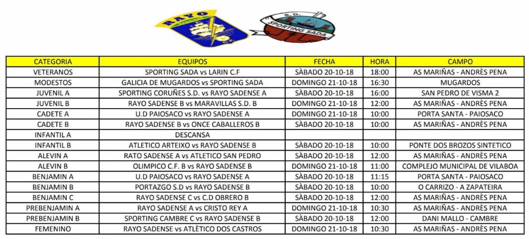 Oct172018ComunicaciónInformamos de los partidos a disputar este fin de semana por nuestros equipos Category: Comunicación17/10/2018 Compartir esta publicación Share on FacebookShare on Facebook Share on XShare on X Share on LinkedInShare on LinkedIn Share on WhatsAppShare on WhatsApp Author: Sada Cf Post navigationPreviousPrevious post:PRESENTACION EQUIPOS TEMPORADA 2018/2019 DOMINGO 14 OCTUBRENextNext post:HORARIOS FIN DE SEMANA PARTIDOSOtras noticias¡¡¡¡¡¡¡¡¡⚽⚽⚽CONVOCATORIA ASAMBLEA XERAL ORDINARIA⚽⚽⚽!!!!!!!!11/10/2024¡¡¡¡¡¡¡¡¡⚽⚽⚽CONVOCATORIA ASAMBLEA XERAL ORDINARIA⚽⚽⚽!!!!!!!!25/09/2024¡¡¡¡¡¡¡¡¡⚽⚽⚽CONVOCATORIA ASAMBLEA XERAL EXTRAORDINARIA⚽⚽⚽!!!!!!!!18/08/2023DEPORCAMPUS 2022 SADA CF14/12/2022¡¡¡¡¡¡¡¡¡⚽⚽⚽CONVOCATORIA ASAMBLEA XERAL ORDINARIA⚽⚽⚽!!!!!!!!21/09/2022¡¡¡¡¡¡¡¡¡⚽🎊 FESTAS DE SAN ROQUE 2022 🎊⚽!!!!!!!!31/08/2022
