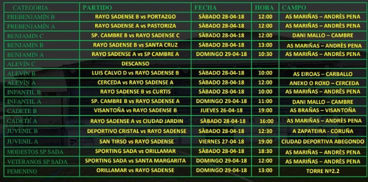 Abr252018HorariosInformamos de los partidos a Disputar mañana Jueves y fin de semana. Category: Horarios25/04/2018 Compartir esta publicación Share on FacebookShare on Facebook Share on XShare on X Share on LinkedInShare on LinkedIn Share on WhatsAppShare on WhatsApp Author: Sada Cf Post navigationPreviousPrevious post:COMUNICADO PREINSCRIPCIONES TEMPORADA 2018/2019NextNext post:EL FÚTBOL BASE PARTICIPA EN EL DIA MUNDIAL DE LA DANZA .Otras noticiasPARTIDOS OFICIAIS PARA ESTA FIN DE SEMANA20/09/2022PARTIDOS OFICIAIS PARA ESTA FIN DE SEMANA13/09/2022PARTIDOS OFICIAIS PARA ESTA FIN DE SEMANA06/09/2022PARTIDOS OFICIAIS PARA ESTA FIN DE SEMANA22/06/2022PARTIDOS OFICIAIS PARA ESTA FIN DE SEMANA14/06/2022PARTIDOS OFICIAIS PARA ESTA FIN DE SEMANA07/06/2022