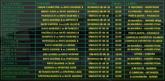 Abr32018HorariosInformamos de los partidos a Disputar este próximo fin de semana. Category: Horarios03/04/2018 Compartir esta publicación Share on FacebookShare on Facebook Share on XShare on X Share on LinkedInShare on LinkedIn Share on WhatsAppShare on WhatsApp Author: Sada Cf Post navigationPreviousPrevious post:HORARIOS COMPETICIONES 7-8 ABRILNextNext post:EL FÚTBOL BASE A RITMO DE DANZAOtras noticiasPARTIDOS OFICIAIS PARA ESTA FIN DE SEMANA20/09/2022PARTIDOS OFICIAIS PARA ESTA FIN DE SEMANA13/09/2022PARTIDOS OFICIAIS PARA ESTA FIN DE SEMANA06/09/2022PARTIDOS OFICIAIS PARA ESTA FIN DE SEMANA22/06/2022PARTIDOS OFICIAIS PARA ESTA FIN DE SEMANA14/06/2022PARTIDOS OFICIAIS PARA ESTA FIN DE SEMANA07/06/2022