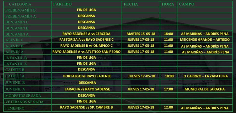 May142018HorariosInformamos de los partidos a disputar el próximo Jueves 17 de Mayo Category: Horarios14/05/2018 Compartir esta publicación Share on FacebookShare on Facebook Share on XShare on X Share on LinkedInShare on LinkedIn Share on WhatsAppShare on WhatsApp Author: Sada Cf Post navigationPreviousPrevious post:HORARIOS DE COMPETICIONES 12-13-MAYONextNext post:FINALIZA EL CURSO DE MONITOR FUTBOL BASEOtras noticiasPARTIDOS OFICIAIS PARA ESTA FIN DE SEMANA20/09/2022PARTIDOS OFICIAIS PARA ESTA FIN DE SEMANA13/09/2022PARTIDOS OFICIAIS PARA ESTA FIN DE SEMANA06/09/2022PARTIDOS OFICIAIS PARA ESTA FIN DE SEMANA22/06/2022PARTIDOS OFICIAIS PARA ESTA FIN DE SEMANA14/06/2022PARTIDOS OFICIAIS PARA ESTA FIN DE SEMANA07/06/2022
