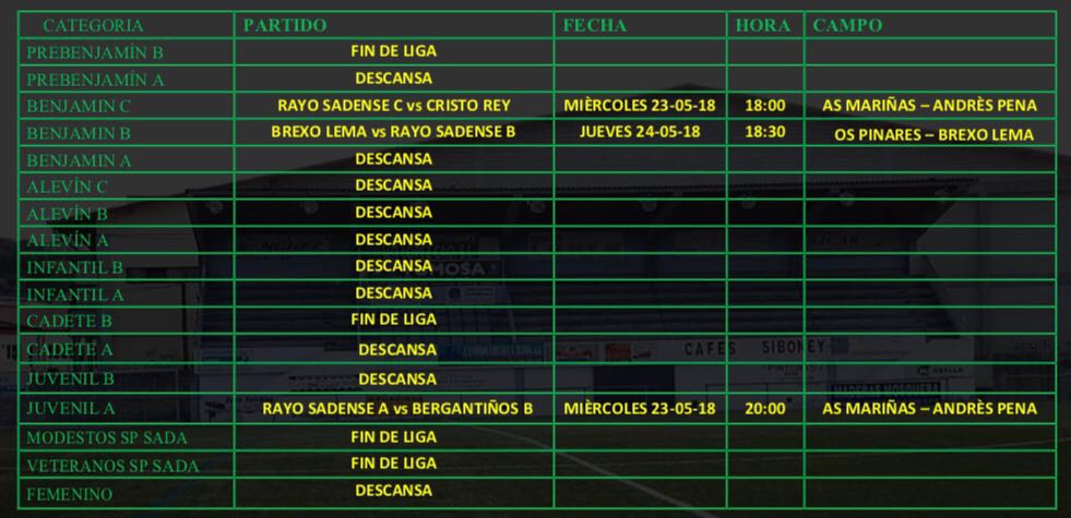 May232018HorariosInformamos de los partidos a disputar Miércoles y Jueves de esta semana. Category: Horarios23/05/2018 Compartir esta publicación Share on FacebookShare on Facebook Share on XShare on X Share on LinkedInShare on LinkedIn Share on WhatsAppShare on WhatsApp Author: Sada Cf Post navigationPreviousPrevious post:I CAMPUS DE FUTBOL PERLA DAS MARIÑASNextNext post:HORARIOS DE COMPETICIONES 26-27 MAYOOtras noticiasPARTIDOS OFICIAIS PARA ESTA FIN DE SEMANA20/09/2022PARTIDOS OFICIAIS PARA ESTA FIN DE SEMANA13/09/2022PARTIDOS OFICIAIS PARA ESTA FIN DE SEMANA06/09/2022PARTIDOS OFICIAIS PARA ESTA FIN DE SEMANA22/06/2022PARTIDOS OFICIAIS PARA ESTA FIN DE SEMANA14/06/2022PARTIDOS OFICIAIS PARA ESTA FIN DE SEMANA07/06/2022